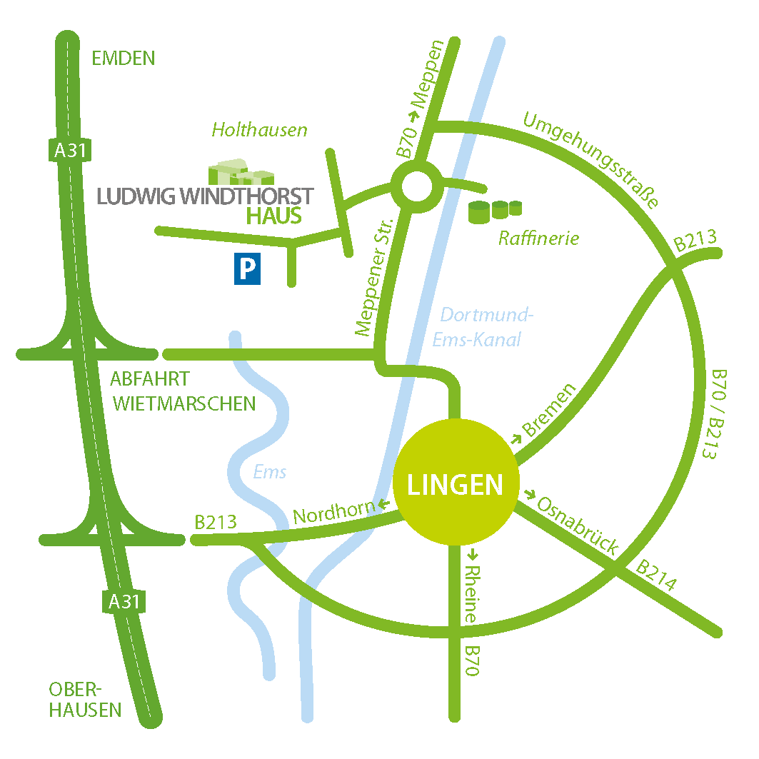 Das Ludwig-Windthorst-Haus liegt etwa 5 km nördlich vom Zentrum Lingens. Von Norden und Süden erreichen Sie das Haus über die A 31, Abfahrt Wietmarschen (Nr. 24). Sie biegen links ab in Richtung Lingen, direkt vor dem Kanal biegen Sie links ab in Richtung Meppen. Nach ca. 1,5 km am Kreisverkehr folgen Sie der Beschilderung. Wenn Sie über die B 70 (von Rheine, A 30 Osnabrück-NL) oder die B 213 (von Nordhorn oder Cloppenburg, A 1 Bremen) oder die B 214 (von Fürstenau, Osnabrück) anreisen, benutzen Sie die Umgehungsstraße (B70 / B213 Richtung Meppen) und wählen die Abfahrt Biene/Holthausen, Richtung Lingen und fahren bis zum Kreisverkehr. Dort biegen Sie rechts ab in Richtung Holthausen und folgen unseren Hinweisschildern.