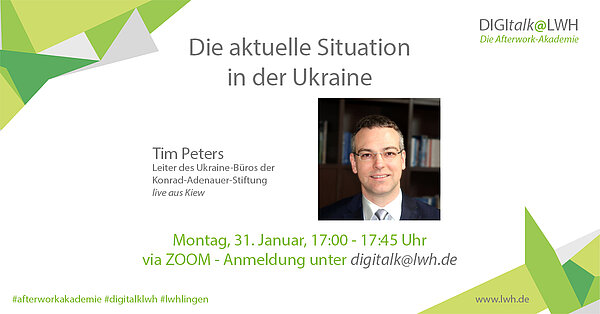Im Gespräch mit dem Leiter des Ukraine-Büros der Konrad-Adenauer-Stiftung, Tim Peters, geht es um die russische Bedrohung und die aktuelle Situation in der Ukraine. Tim Peters wird für unsere Afterwork-Akademie DIGItalk@LWH live aus Kiew dazu geschaltet.